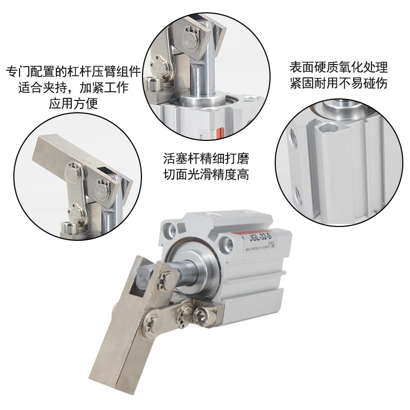 JGL杠桿氣缸專門配置的杠桿壓臂組件,能夠勝任一般的夾持、夾緊等工作,應用方便。JGL杠桿氣缸活塞桿精細打磨,切面光滑精度高;杠桿氣缸缸體表面硬質氧化處理,緊固耐用不易碰傷。