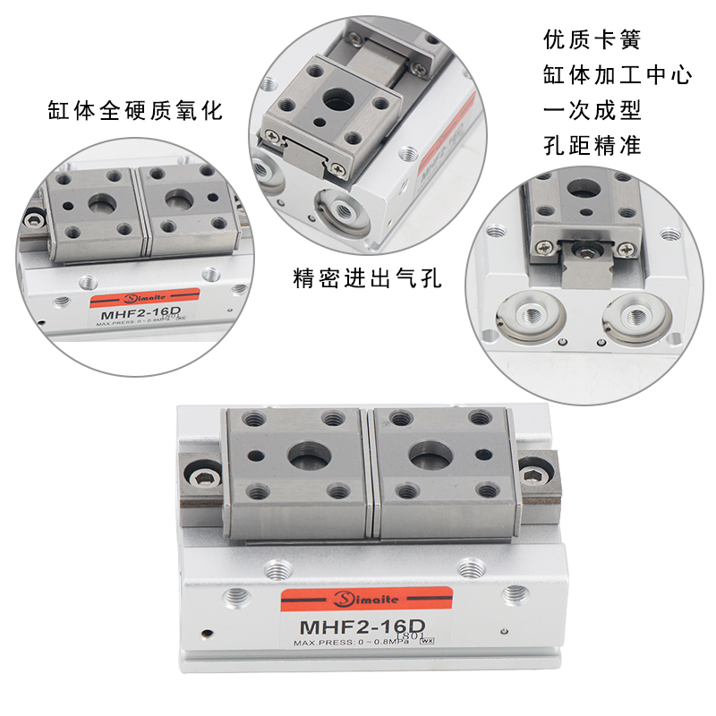 5、優(yōu)良卡簧:手指氣缸MHF2的缸體加工中心一次成型,孔距準確。