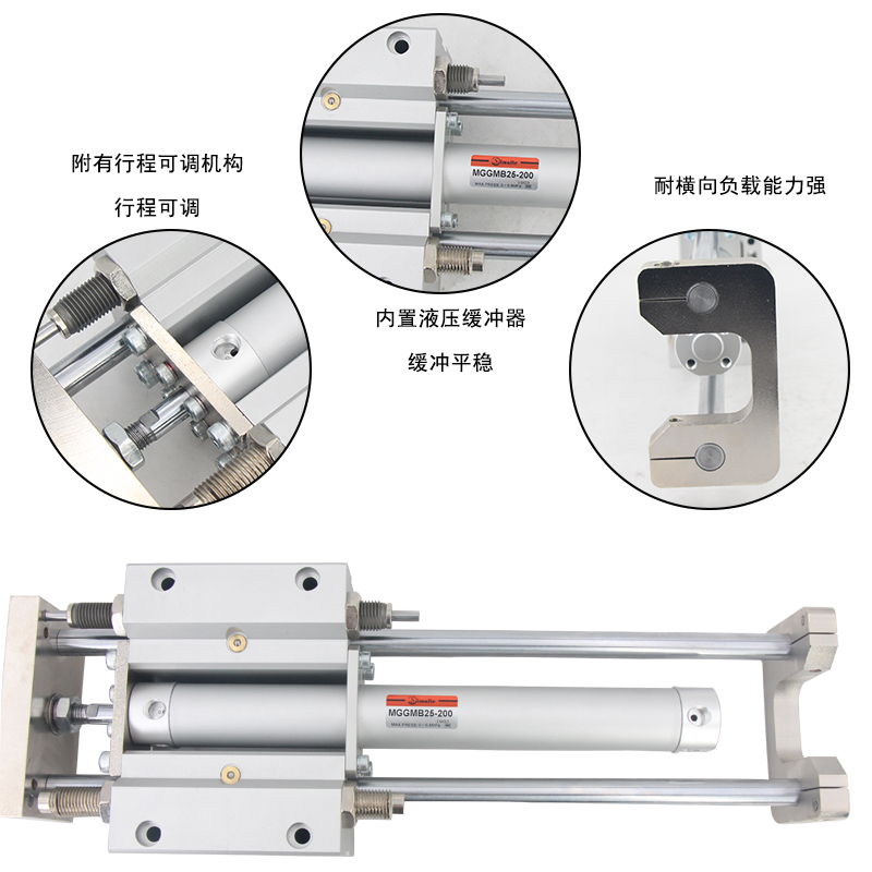 1、MGG帶導(dǎo)桿氣缸內(nèi)置液壓緩沖器,緩沖效果佳;